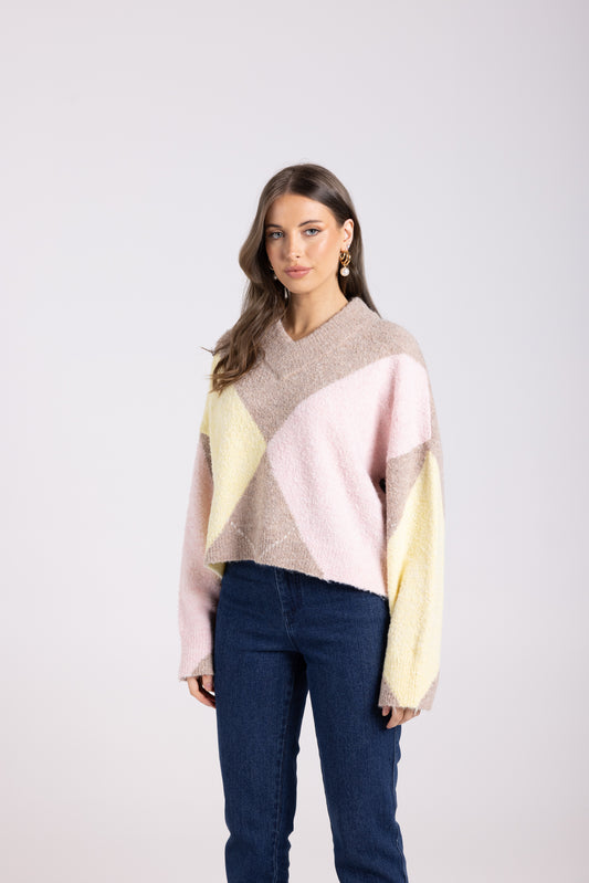 High V Neck Sweater With Diamond Design