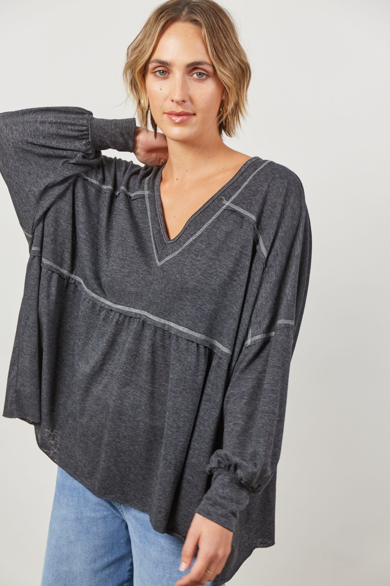 Achieve sporty chic with the Ambition Tshirt, crafted from a soft cotton blend. This tshirt will be your go-to for casual comfort on laidback days, offering an easy-going, relaxed fit, a V-neck, long sleeves, and a high-low hem. With contrast stitching providing a subtle yet stylish detail, pair it with leggings, a vest, sneakers, and a cap.