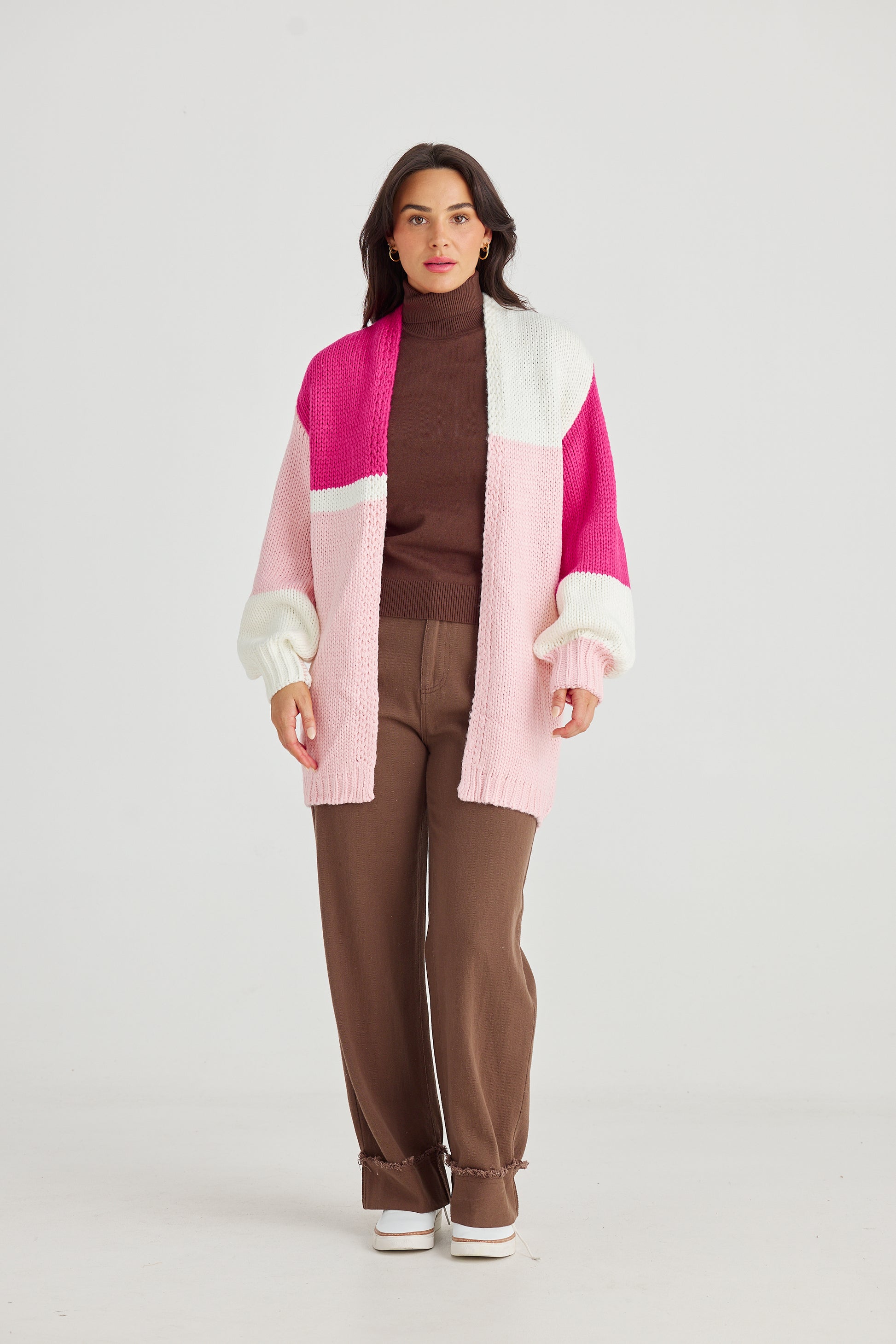 Get cozy in the Bailey Cardi! This playful pink color block cardigan features a relaxed fit that falls to mid-thigh, perfect for layering. With full length sleeves and a one size fits most design, you'll be looking cute and feeling comfy all day long. BUST = O/S: 108cms |