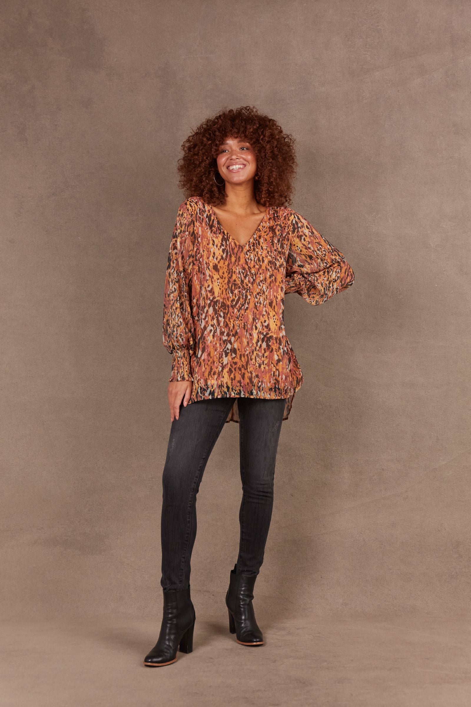 Dazzle at your next event with the Bantu Top, an exquisite sheer number threaded with shimmering lurex. Its flattering neckline, sheer bishop sleeves, and relaxed hem promise instant glamour. Complete the look with leggings, boots, and statement accessories for a sophisticated ensemble that captures attention and radiates evening allure.