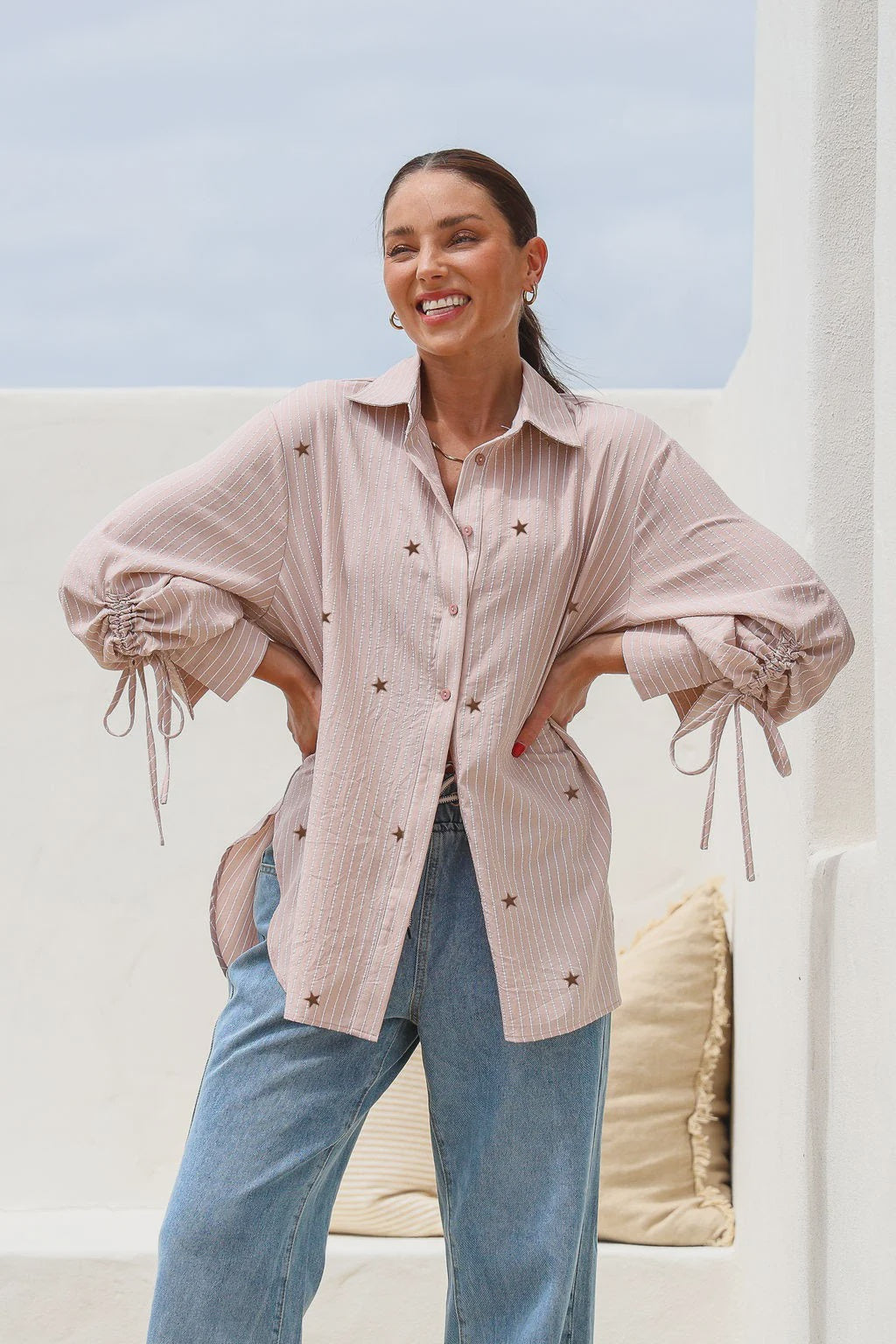 Embrace a laid-back vibe with the Billie Star SHIRT. Its roomy silhouette, tie elastic wrist, and oversized design will keep you both comfy and chic. The perfect addition to your wardrobe for a playful twist. (Tie up your look with this quirky, oversized top!)