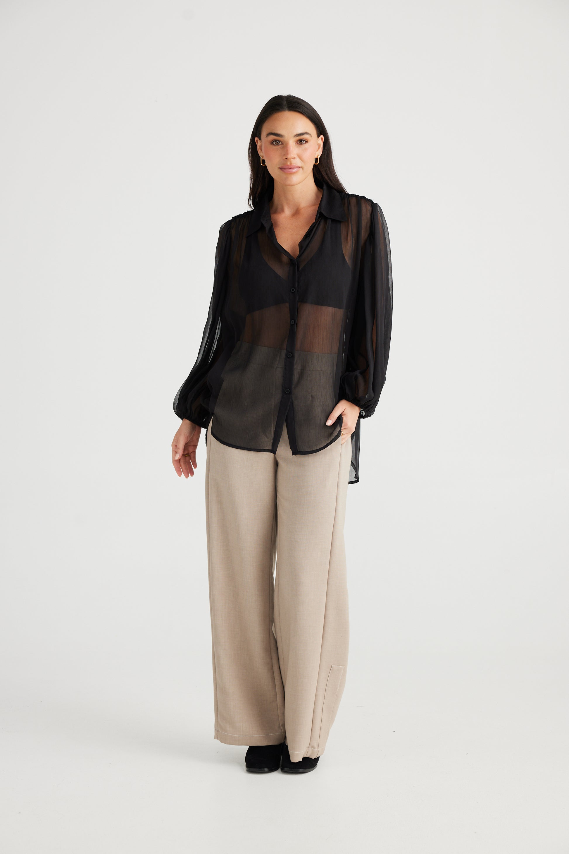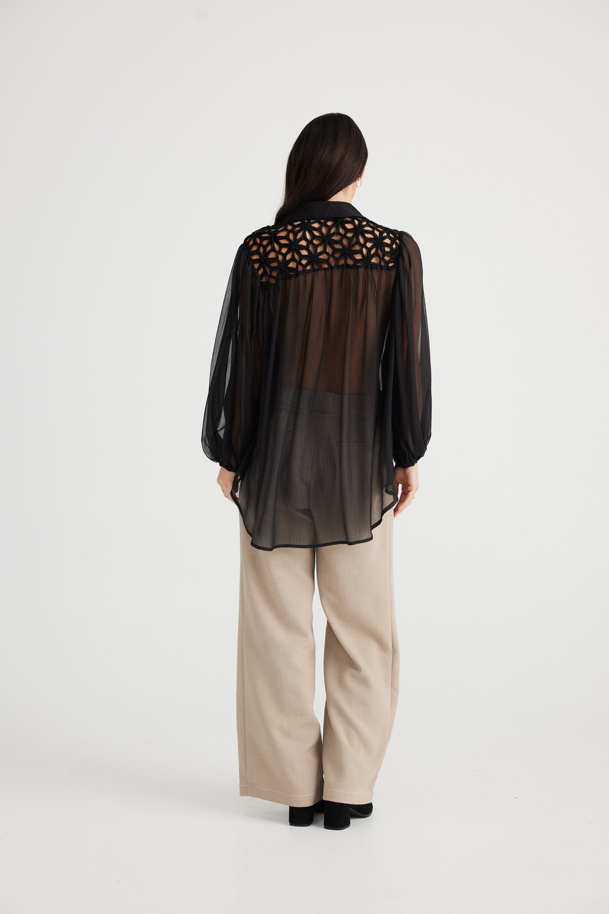 Upgrade your wardrobe with the Eden Shirt. This lightweight chiffon shirt features a classic collar and front button stand for a timeless look. The unique lattice weave in the back yoke adds a touch of interest, while the long sleeves with elasticated cuffs provide comfort and style.