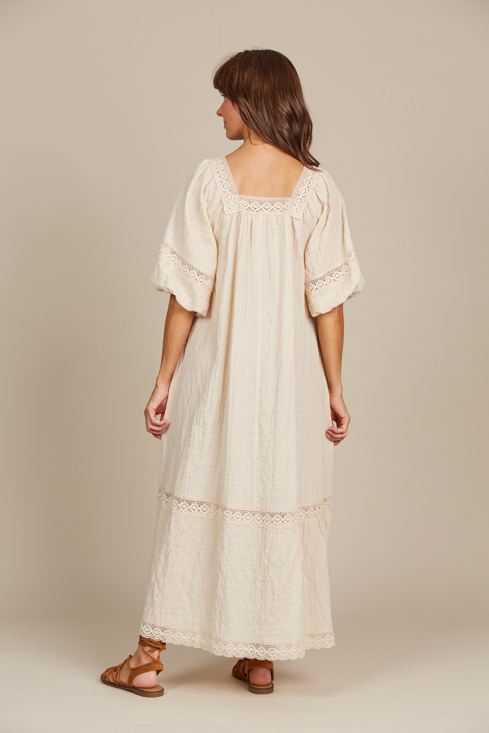 For those Sunday mornings at the market or days filled with errands, the Fleur Maxi is your go-to dress. With its relaxed fit and comfortable textured cotton blend, this maxi is effortless to wear. Lovely lace trimmings highlight the square neck, bishop sleeves, and hem, infusing the dress with a gentle, feminine charm. Slip into slides, grab a tote bag, and you're ready for the weekend!