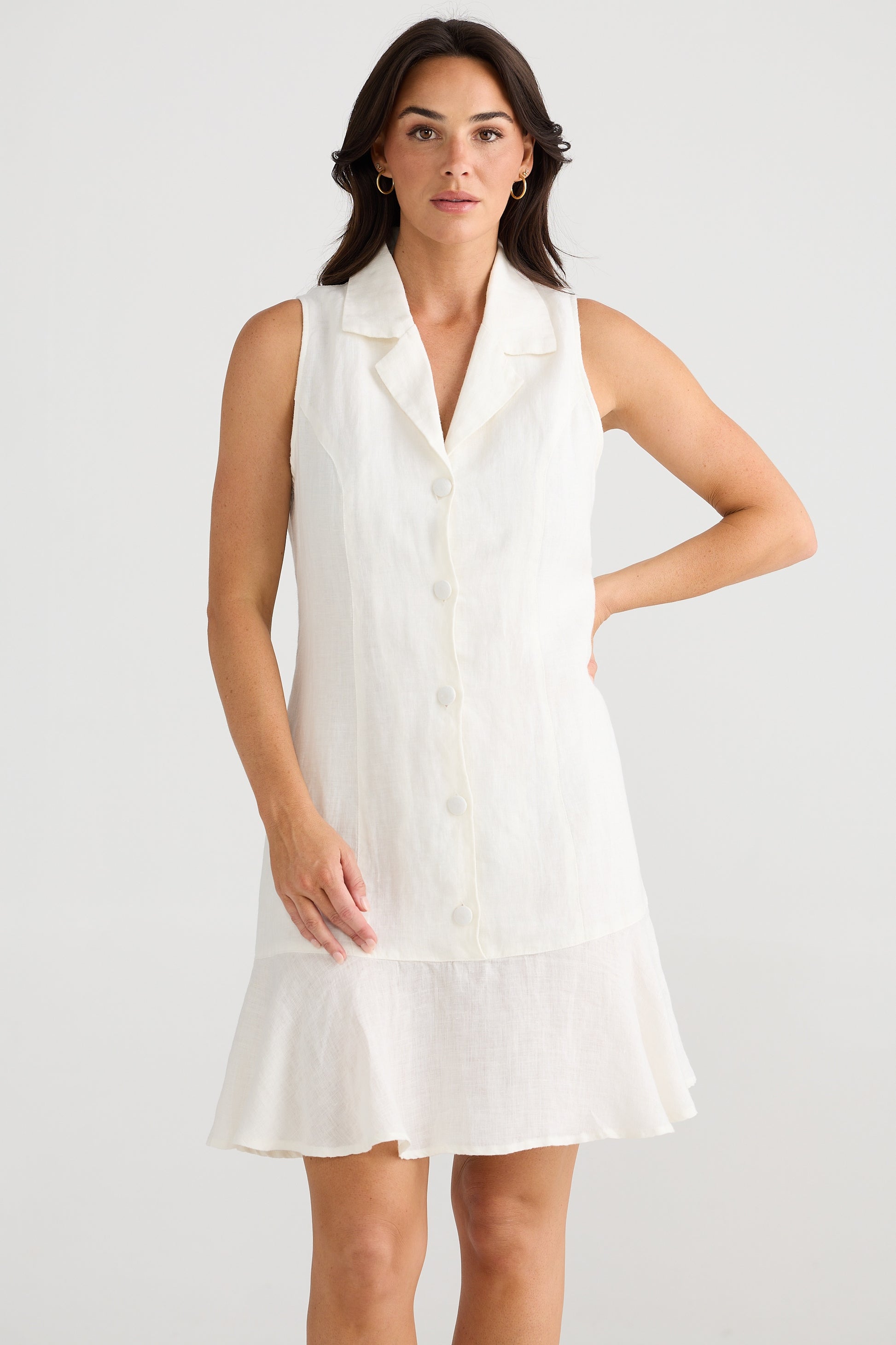 Get ready to turn heads with the Katie Dress! The open collar design and flared hem panel add a touch of elegance to this playful, sleeveless dress. Sitting above the knee, it's perfect for any occasion. Upgrade your wardrobe with this dress today!