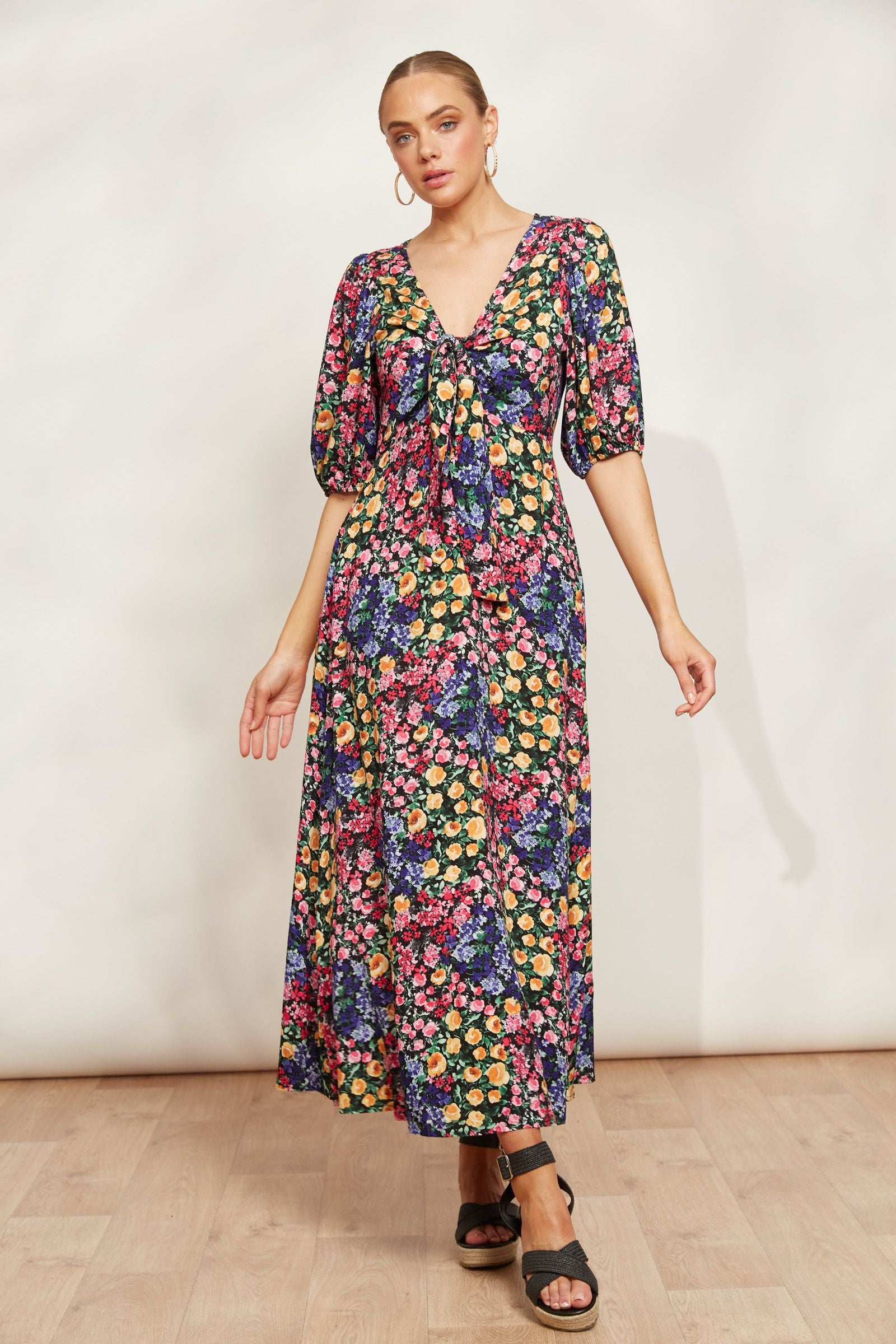 The La Mer Tie Dress is your secret to always looking put together. Whether you're mingling at a garden party or enjoying a romantic dinner in the city, this maxi dress brings all the charm and elegance. It features a V-neck and adjustable self-tie, elbow-length balloon sleeves, and a zip closure at the back. Complete the look with strappy sandals, shiny metallic accessories, and a statement clutch for that extra wow factor!