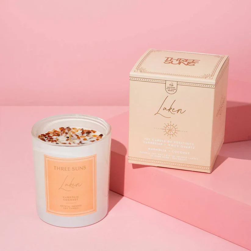 Introducing Laken' - the ultimate wingman for any party! Infused with Carnelian crystals, this candle's blend of coconut and magnolia not only smells amazing, but also boosts confidence and motivation. Let Laken' help you conquer the dance floor and crush your goals with its stimulating scent. Let the good times roll!