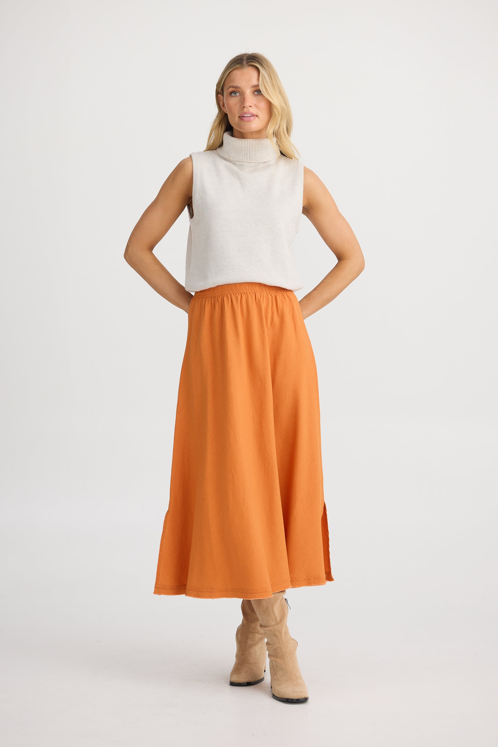 Get ready to flow with style in the Shanty Sicily Skirt! This ankle length skirt features a stretchy elastic waistband and playful side splits. The bias cut adds a touch of uniqueness, while raw edge trim adds a fun, raw look.
