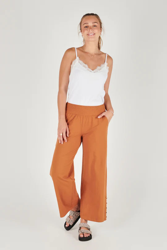 Ultimate comfort in the Shirred Waistband Pant from One Ten Willow. The pant includes a wide leg opening, side leg button detail and side seam pockets.