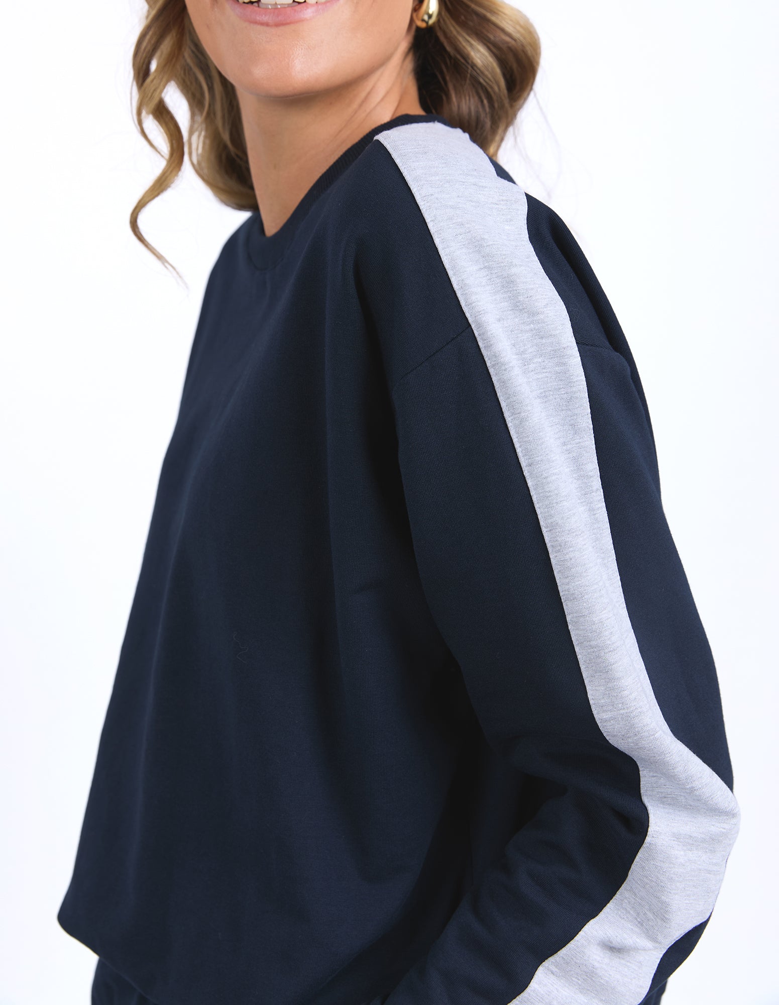 - A comfort + crew with a touch of Elm colour and fun. Featuring a fun side stripe panel along the shoulder and sleeves this relaxed fit jersey crew looks great worn with your favourite loungewear or pop it on with the Sloane Skirt for a comfort + lounge set.