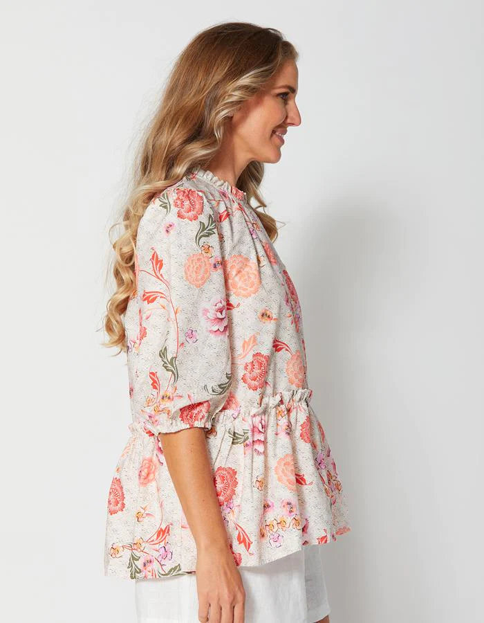 Crew neck ¾ sleeve blouse with frills on neckline and waist seam & back neck keyhole split