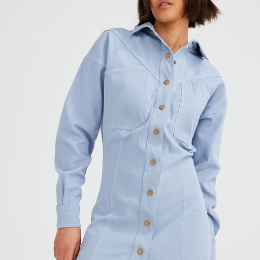 Looking for a classic collared style dress with front press stud closure, relaxed, boxy fit and slim fit over the hips? Look no further! Our mini length Violet dress is perfect for autumn. It has a front patch pocket feature, front and back yoke detailing and contrast stitching, making it an essential item for the season.
